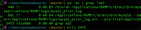L’idée ici est de tout simplement « tuer » les processus MySQL après avoir correctement quitter l’application. Il vous suffira ensuite de démarrer de nouveau MAMP et lancer les serveurs.